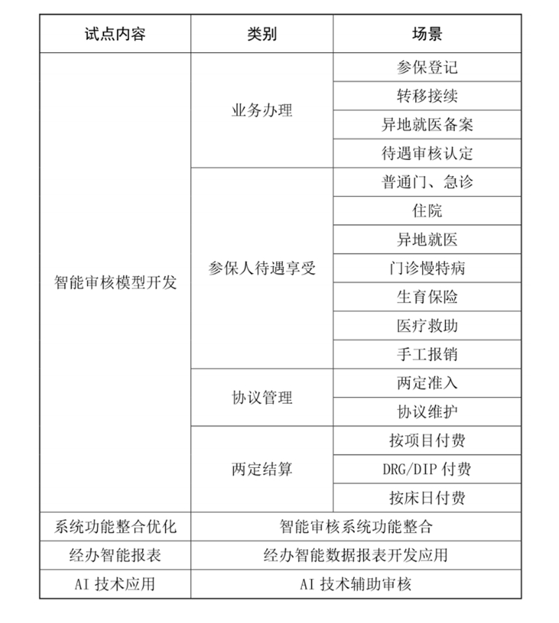 试点省份根据实际情况,结合本地优势和特点,按照经办智能审核场景范围(详见附件),从功能优化、审核模型、智能报表等内容中选取部分推进试点工作:选取系统功能优化作为试点内容的,要探索完善经办费用审核流程,整合优化智能审核系统功能,实现智能审核功能嵌入经办环节,促进系统功能易用好用;选取审核模型制定作为试点内容的,可从业务办理、待遇享受、协议管理、两定结算等全业务环节中选取部分类别场景开发,逐步推进建立审核规则全业务流程覆盖。探索建立智能审核政策、药品、耗材、服务项目知识库,开发DRG/DIP付费、门诊慢特病等智能审核规则,满足支付方式改革、即时结算等改革任务需要;选取经办智能报表作为试点内容的,要完善经办数据专区,明确经办业务数据标准内涵,开发完善智能报表功能,建立多维度数据主题,实现数据报表自定义拓展。提高数据分析提取效率。若意愿的试点内容不在试点范围的,应提前与国家局沟通确认。
