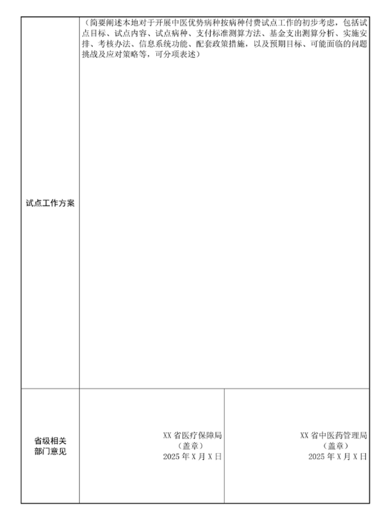 各省级医保部门会同中医药主管部门按照要求组织开展试点遴选申报工作,可以省或地市为单位申报试点。原则上每个省份不超过1个试点,以省为单位申报试点的,全省需统一中医优势病种目录。书面申报材料经省级医保部门和中医药主管部门审核同意后,于2025年10月31日前同时报送至国家医疗保障局和国家中医药管理局。国家医疗保障局和国家中医药管理局组织专家研究确定试点名单,并指导做好试点工作。