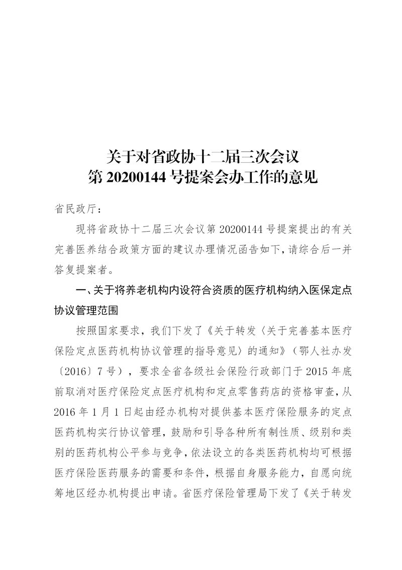 湖北省医疗保障局对省政协十二届三次会议第20200144号提案会办工作的意见