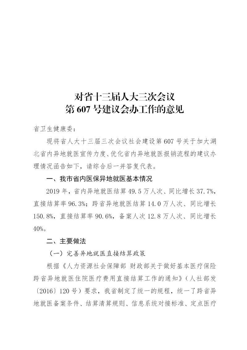 湖北省医疗保障局对省十三届人大三次会议第607号建议会办工作的意见